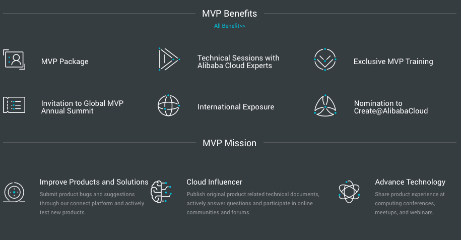 By becoming an MVP, you can gain exceptional recognition for your contributions to the community and take advantage of the privileges provided by the Alibaba Cloud, for example, MVP Medal, meeting with internal Alibaba Cloud experts for an unlimited period, exclusive Alibaba Cloud services, an invitation to Alibaba Cloud official activities and visit Alibaba headquarters.
